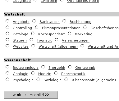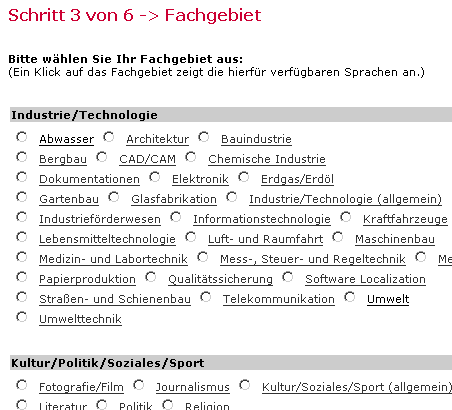 Wählen Sie hieraus Ihr Fachgebiet. TIPP: Jedes Fachgebiet ist gleichzeitig ein Link. Durch Klick auf diesen Link öffnet sich ein separates Fenster, in dem alle Sprachen angezeigt werden, in die das Fachgebiet derzeit übersetzt werden kann.